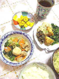 3、【ちゃんこ風(白菜,小松菜,人参,牛蒡,鶏肉,イカ団子,他)】